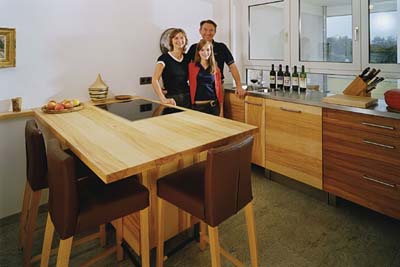 Auch diese Ahornküche hat viele Messen und Kochshows erlebt, ehe sie im neuen Holzhaus von Kornelia und Peter Ottmann einzog. Aber verkauft war sie gleich am zweiten Tag der ersten Messe, denn Peter Ottmann ist der Pressesprecher der Messe Nürnberg und damit bei der Consumenta an der Quelle.