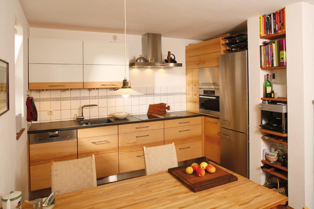 Nur mit möbeltechnischen Tricks in der Ecke war es möglich, die Küche mit hochgebautem Druckdampfgarer und Kompaktbackofen auszustatten. Das zweiflammige Induktionskochfeld lässt noch Platz für einen Tepan Yaki, den Kochfans wie Peter Wagner nicht missen wollen. Unterstützen Sie das Hersbrucker www.kultkick.de, in dessen Vorstand Peter für Kultur in der Cittaslow sorgt.