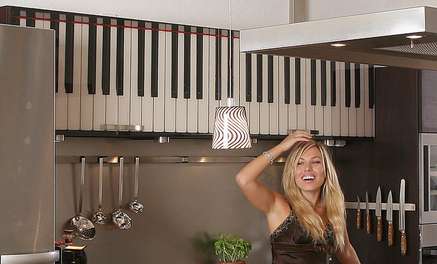 Eine Klaviertastatur ist das durchgängige Gestaltungsmotiv in Laras Loft, hier als Fotodruck auf der Küchenglasfront