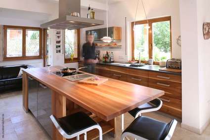 Die Küche ist (für unsere Küchen) "klassisch" ausgestattet, alle Geräte stammen aus der neuen Miele Titanserie, die keine Fingerabdrücke mehr kennt. Den Miele Combidampfgarer wählte Familie Mai, weil Andreas gerne Brot bäckt (kombiniert Dampf mit Heißluft und kann deshalb auch bräunen), der Titandunstabzug bauten wir in 120 cm Breite über den Tepan Yaki und das Induktionskochfeld, das durch die niedrigen Temperaturen auf der Glaskeramikplatte für Kinder wesentlich sicherer ist, als das konventionelle Kochfeld mit Heizspiralen.In die Hochschrankwand integrierten wir einen Sekretär, der Notebook und kleine Drucker aufnimmt, weil man dort nicht nur nach Emails, sondern auch nach Kochrezepten schauen kann. Die Hochfaltklappe drüber verdeckt die Bar des Hauses.