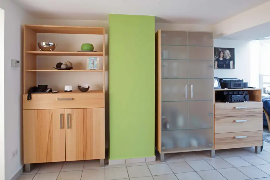 Direkt neben der Küche sind in der gleichen Holzart Wohnzimmerschränke mit Vitrine untergebracht