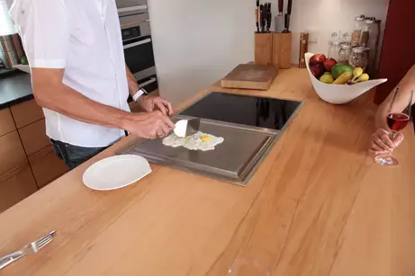 Wenn dann mal klar ist, wie die Küche aussehen aussehen soll, dann kann man auch die Geräte auswählen. Das Induktionskochfeld mit Tepan Yaki (von Jaksch) gehört bei den Möbelmacherküchen meist dazu, weil das Kochen darauf einfach Freude macht, der Druckdampfgarer (Miele) ist eher das Vernunftgerät, das wahninnig viel Zeit und Reinigungsarbeit spart. Der Dunstabzug von Gutmann muss die riechbaren Ergebnisse der Kochfelder vernünftig verschwinden lassen.
