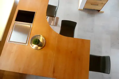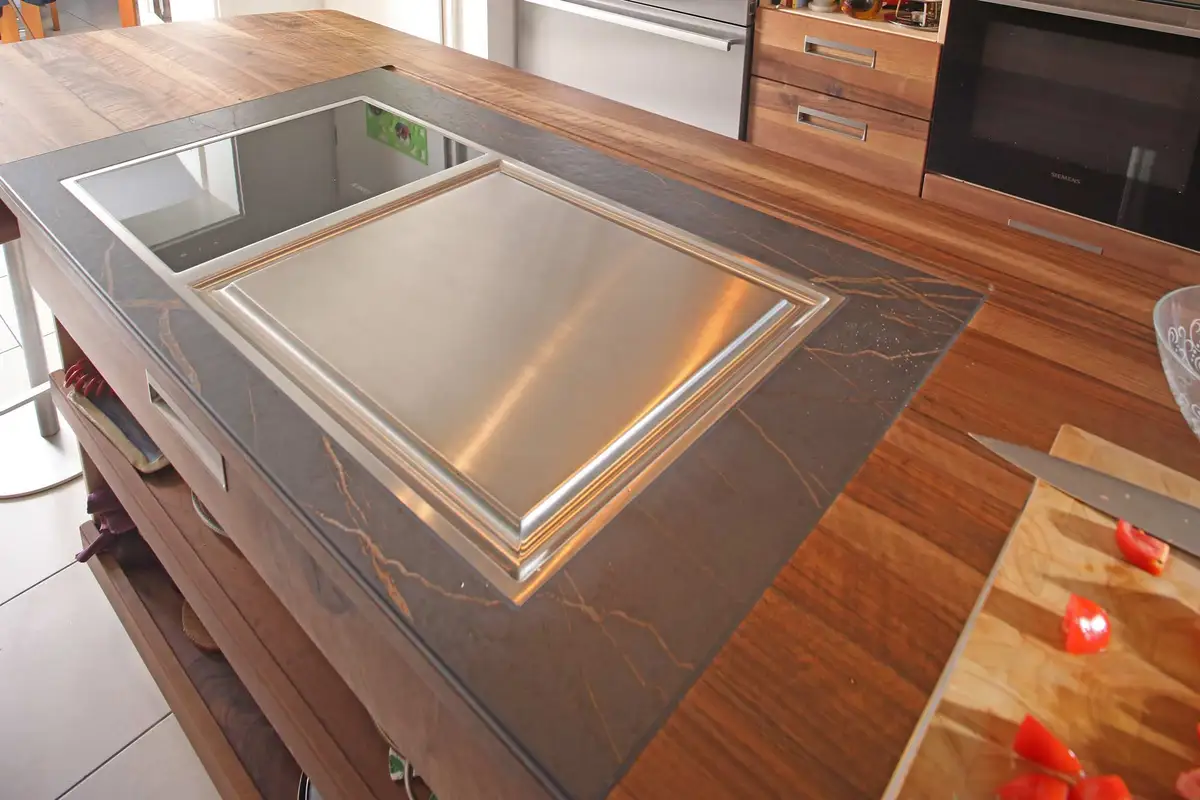 Normalerweise wird das Kochfeld in die Holzarbeitsplatte der Kochinsel direkt eingebaut, manche Kunden wünschen es sich aber flächenbündig in Keramik. Alles ist machbar ...