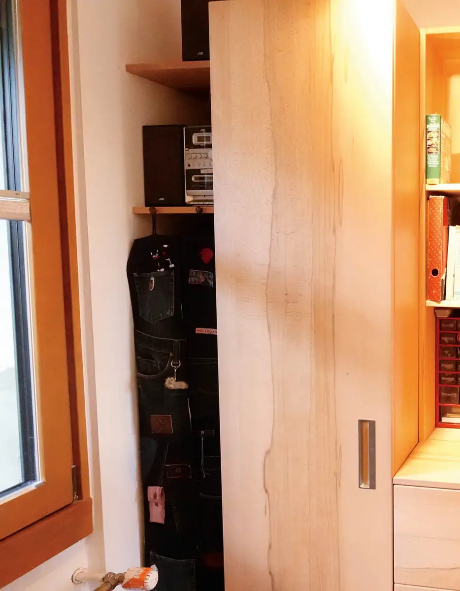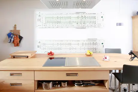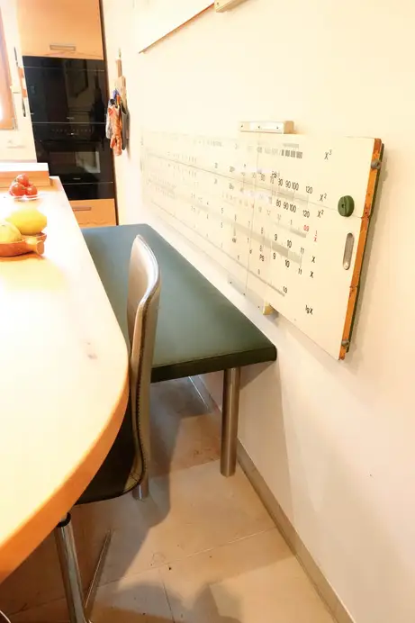 Auch die Küchenplanung war ein langer Prozess bei dem sich die freistehende Kochinsel mit Bank und einem Rechenschieber zum Anlehnen herauskristallisierte. Schon alleine wegen der Versorgung der Söhne nebst Enkel, die dort begeistert Platz nehmen. Die zwei Meter langen Rechenschieber für Lehrer rettete Herr Reinhardt bei Faber-Castell vor der Vernichtung, jetzt kommen sie zu neuen Ehren. Das Verdecken des Bügelbretts, welches eine eigene Nische in der Ecke erhielt, übernahm Frau Reinhardt selbst mit zwei Schals aus zusammengenähten Jeans, die auf Knöpfe im Fachboden gehängt werden. Das ist originell und hat Charme.