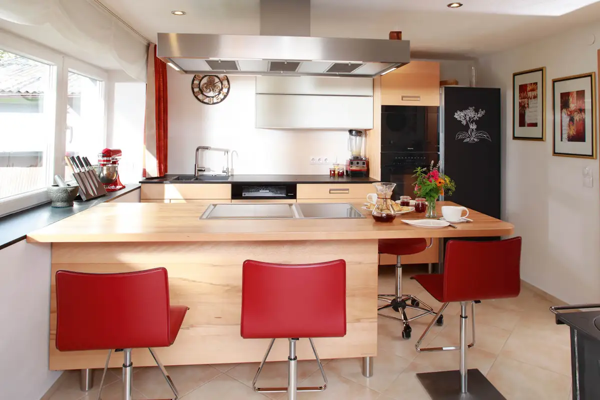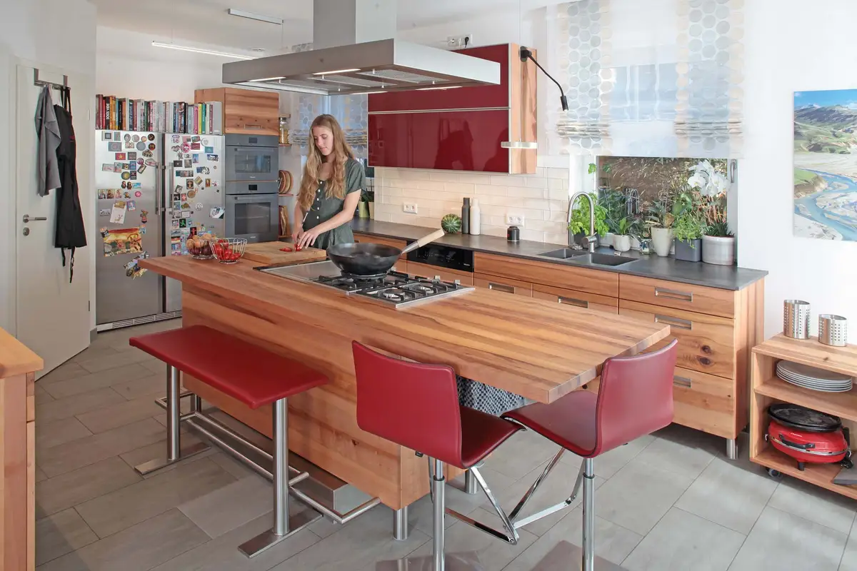 Massivholzküche aus fränkischer Elsbeere mit Rot und passendem Essplatz