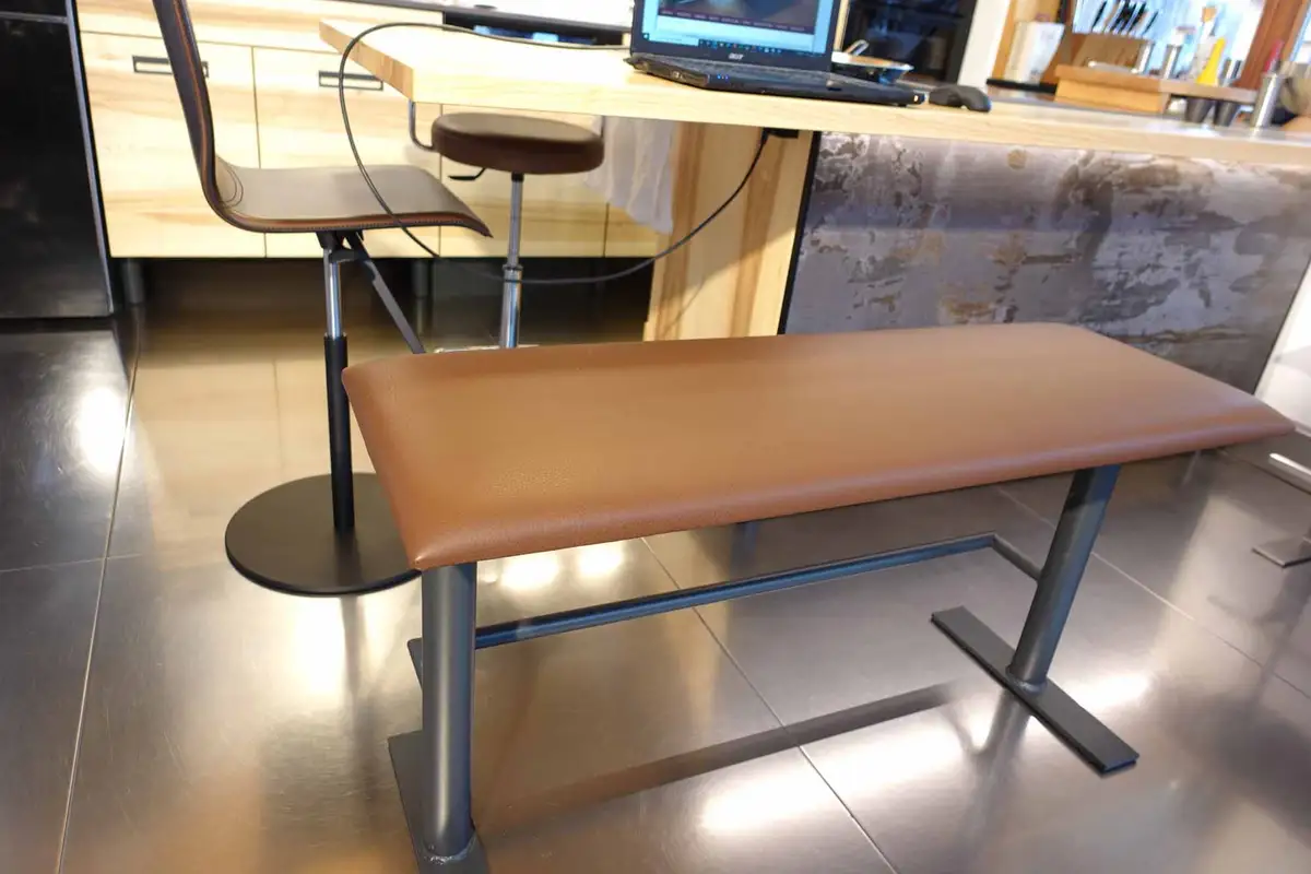Lederbezogene und pulverbeschichtete Bank, bequemer Hocker mit Rückenlehne und der Rollhocker machen die Insel einladend