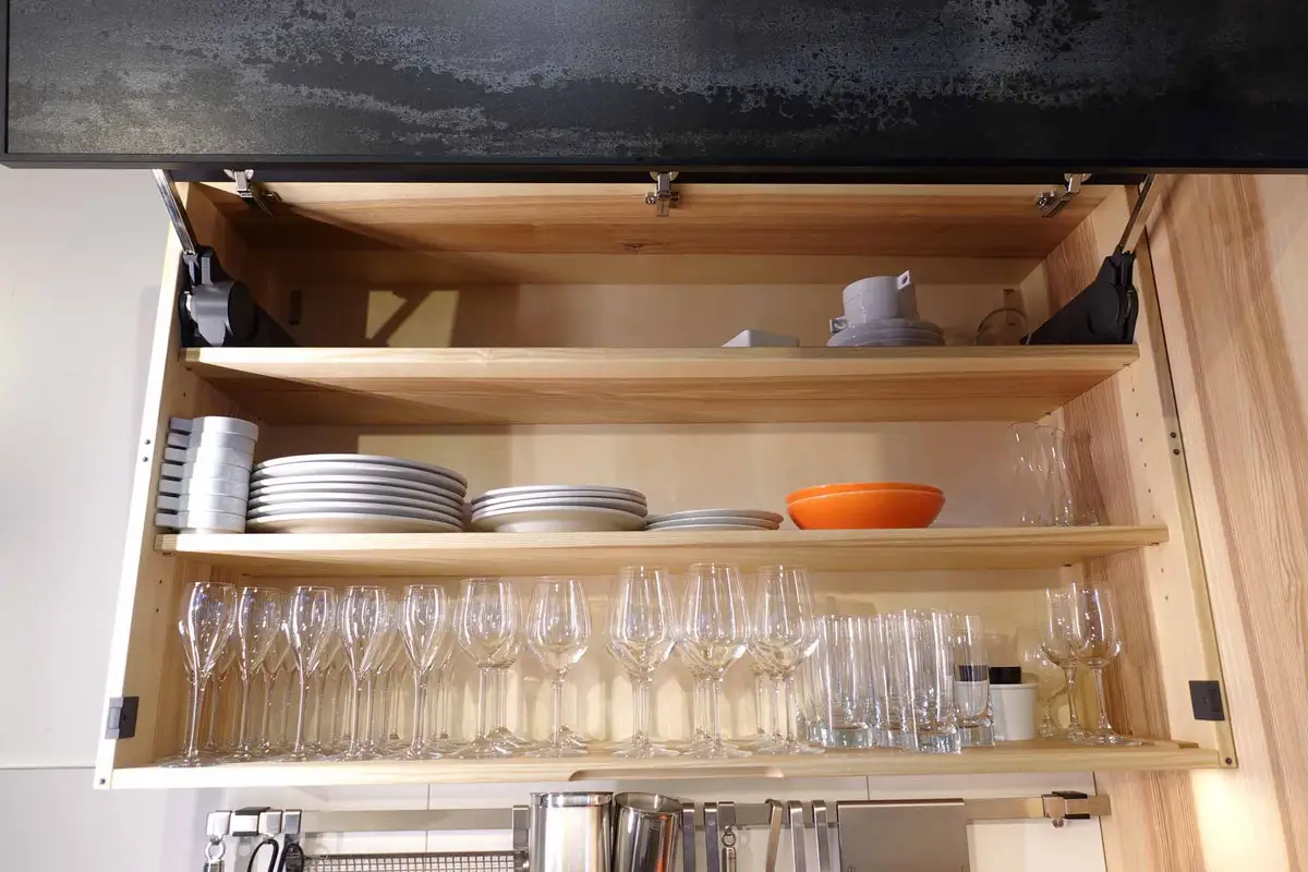 Der Motor öffnet die Hochfaltklappe nach einem kleinem Stubbs auf die Keramikfront und schließt sie, nach einem Druck auf die seitlichen Sensoren in der Schrankseite