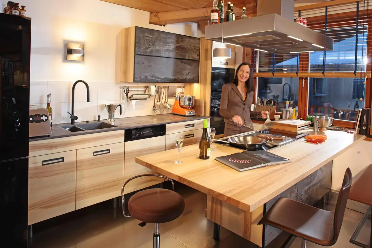 Die Küche besitzt einen Druckdampfgarer, einen Brotbackofen, den großen Tepan Yaki und die Laborarbeitsplatte von Systemceram. Weil im Blockhaus beim Schwinden die Wände niedriger werden, steht der Oberschrank frei auf der Arbeitsplatte.