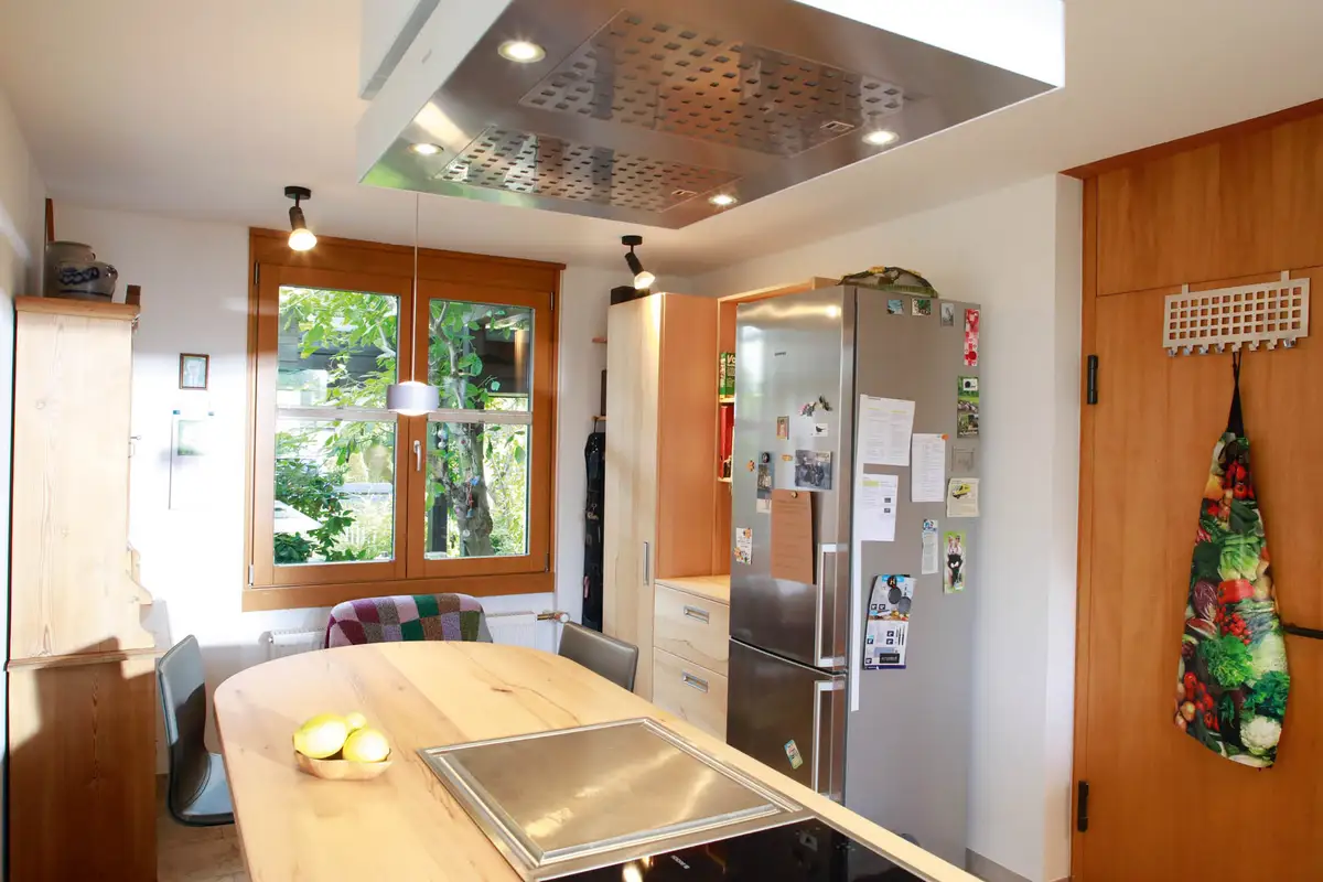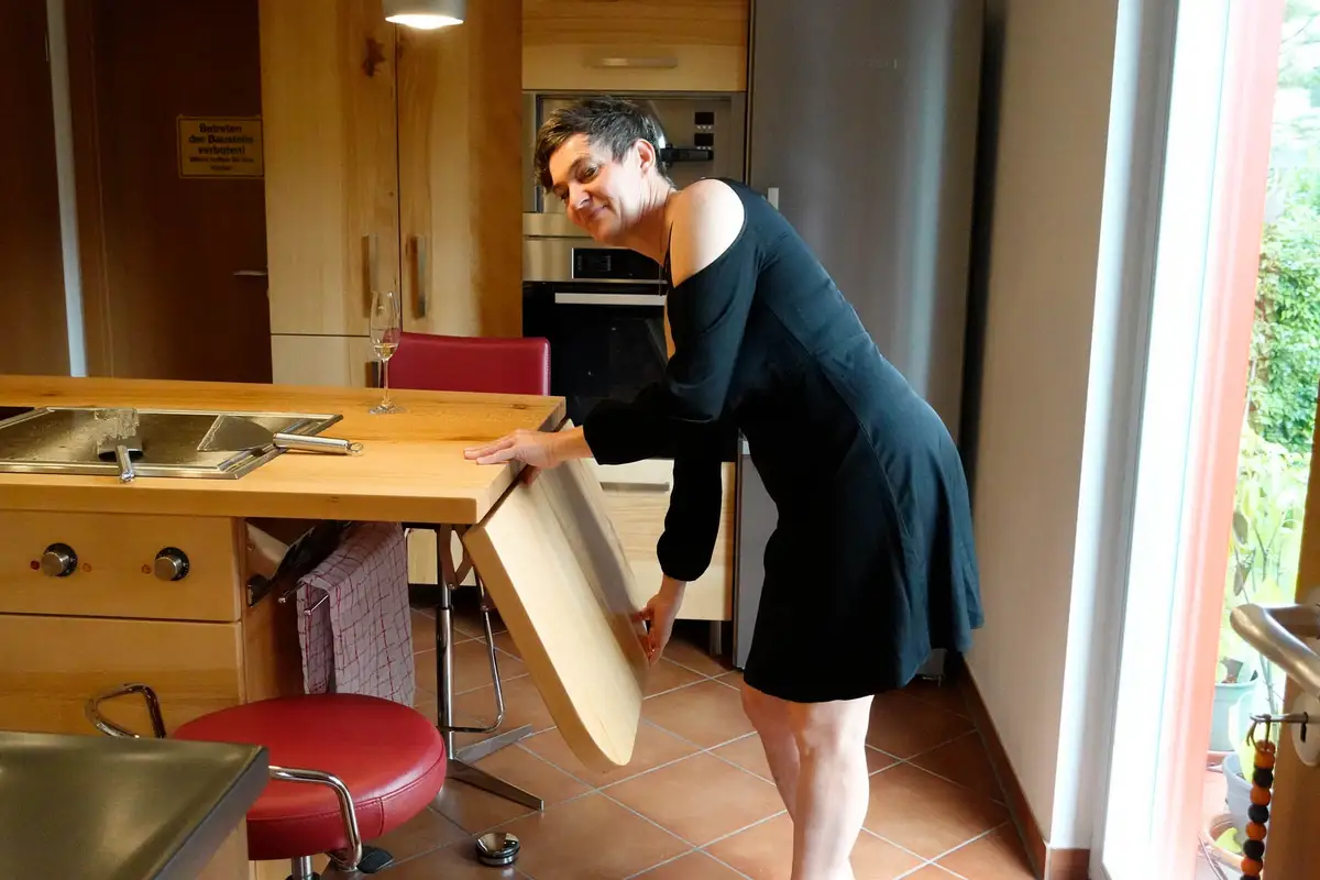 Massivholzküche mit Klappe an der Kochinsel, um die Gartentür ganz öffnen zu können