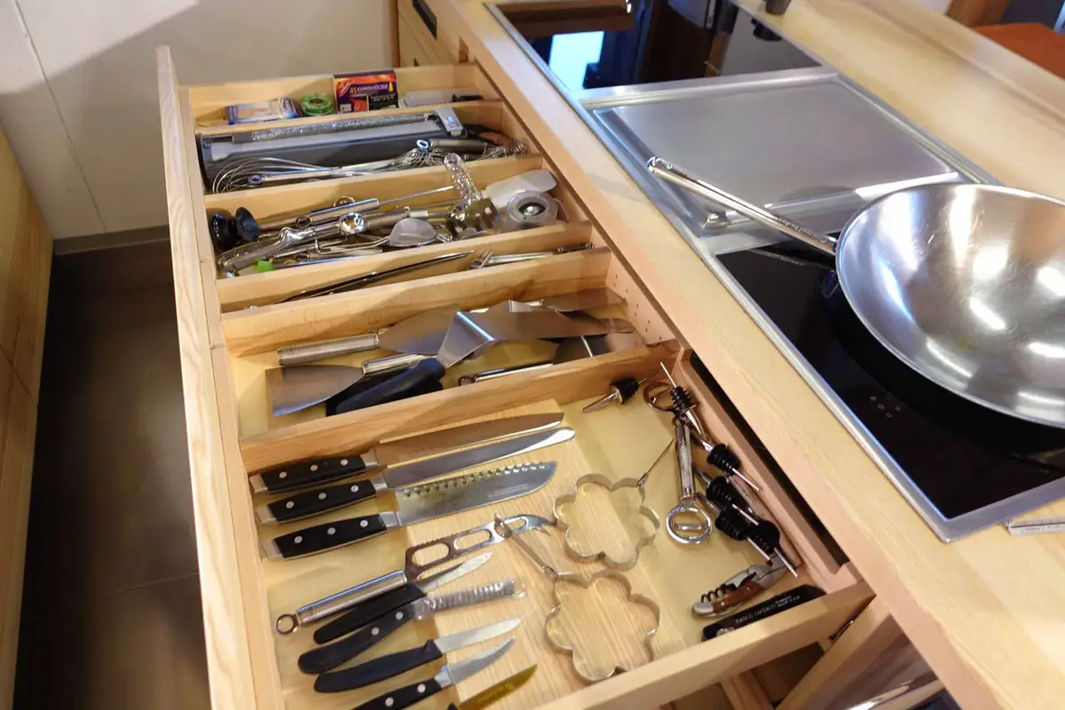 Kochbesteckeinteilung mit Magnetmesserhalter unter dem Kochfeld