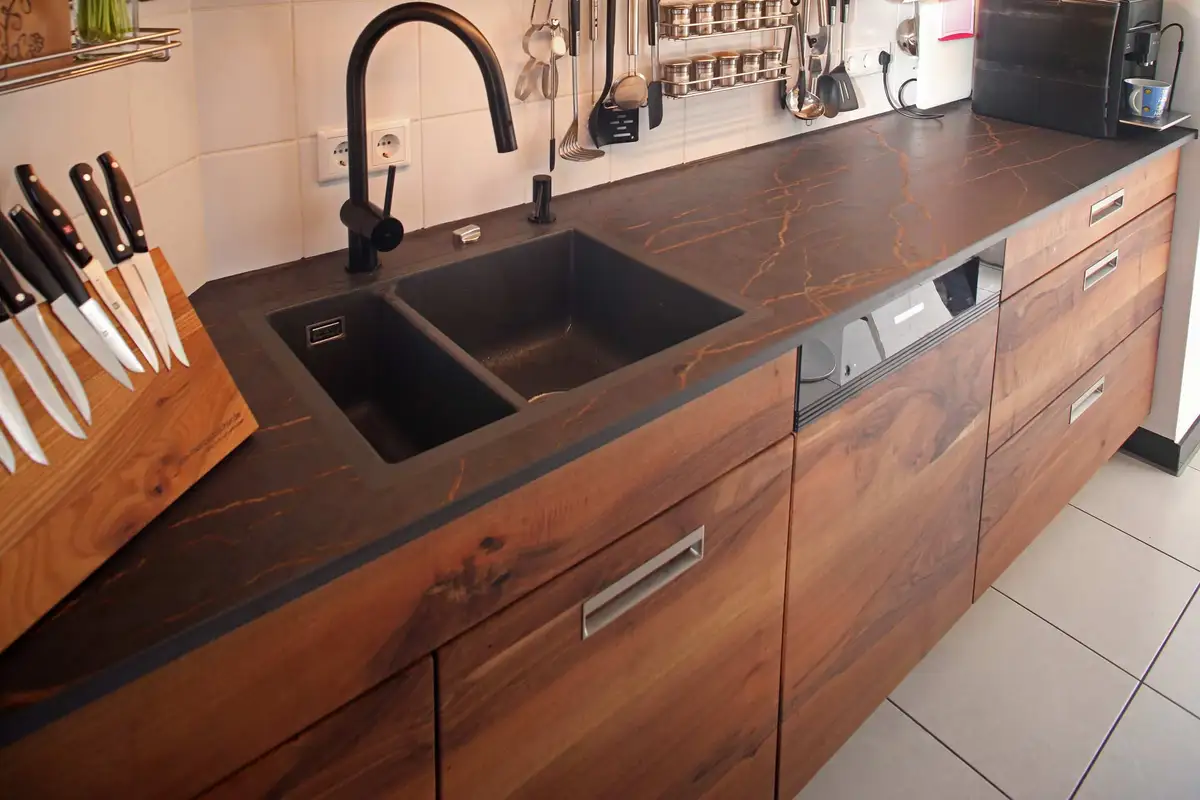 Arbeitsplatte aus unkaputtbarer gesinterter Keramik, die Spüle aus ebenfalls unkaputtbarer Laborkeramik, die Mischbatterie von MGS