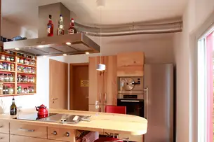 Mit dieser Elsbeerenküche hatten wir das Glück, dass unsere Küchenspezialisten gleich bei der Montage Fotos gemacht haben und das Pech, dass der "richtige" Fototermin erst ein Jahr später stattfand. So können wir jetzt endlich zeigen, wie stark sich die Elsbeere im Laufe ihres Küchenlebens verändert, denn uns ist wichtig, dass Sie das schon vorher wissen. Und so haben wir dieser edlen Massivholzküche mit roten Oberschrankfronten nebst dem angrenzenden Essplatz eine Sonderseite mit Video und 360 Grad-Ansichten gewidmet.
