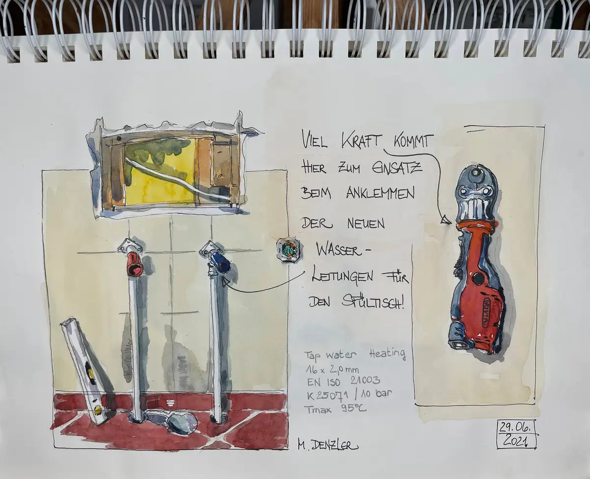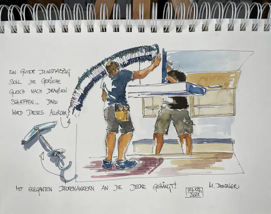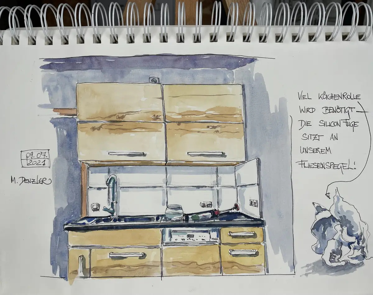 Nein, unser Team musste nicht stundenlang stillhalten, die Zeichnungen entstanden während einer ganz normalen Küchenmontage an zwei Tagen.
