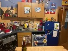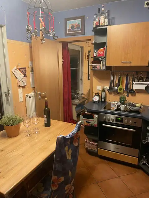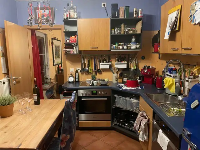 Vorher war es eine L-Küche mit einem vor die Gartentür geschobenen Tischchen, an dem die fünfköpfige Familie nicht wirklich Platz fand. In der neuen Version wurde es eine dreizeilige Küche mit (danke Klappe) großer Insel, an der jetzt zusätzlich noch für Freunde Platz ist, wenn auch nicht für alle.