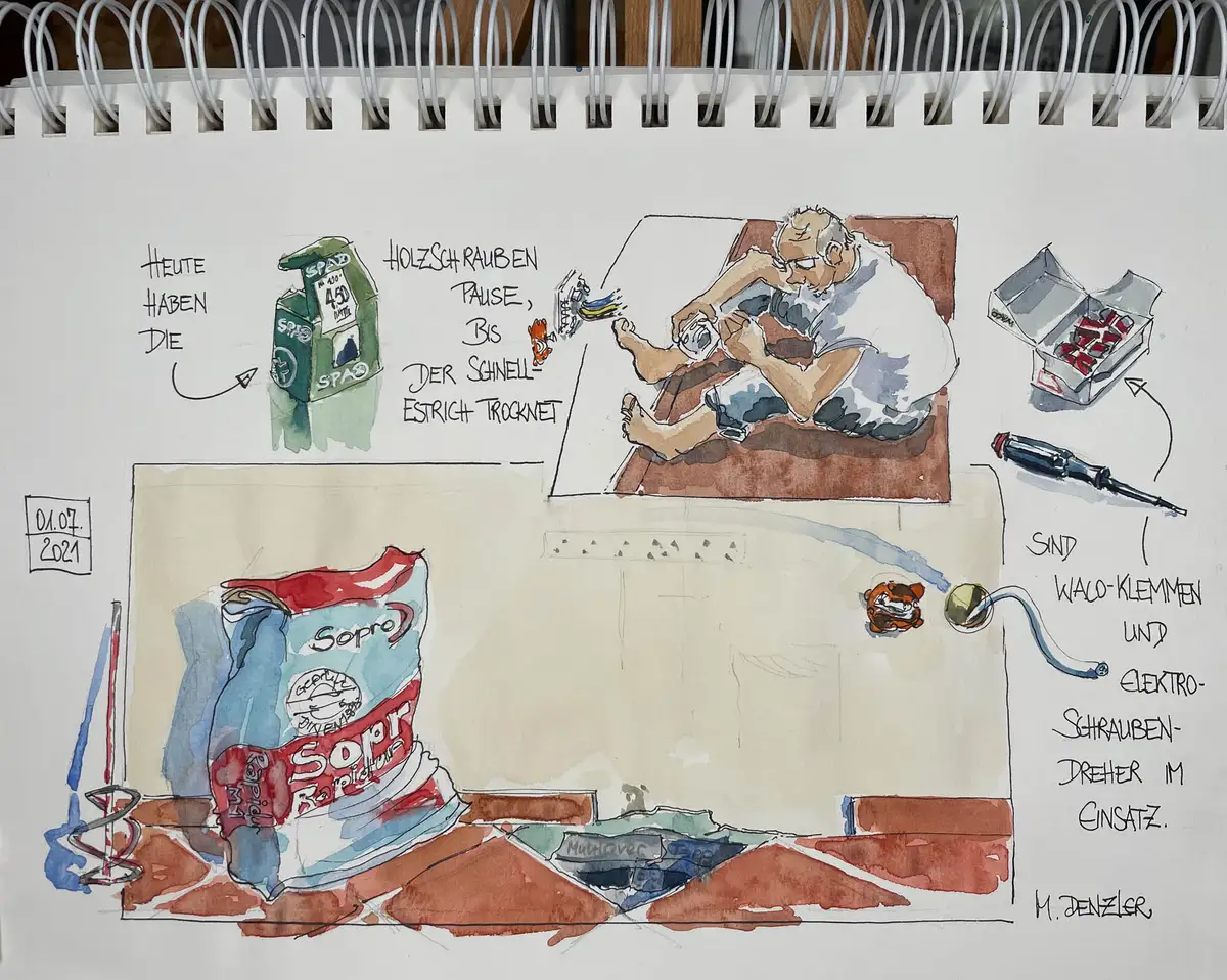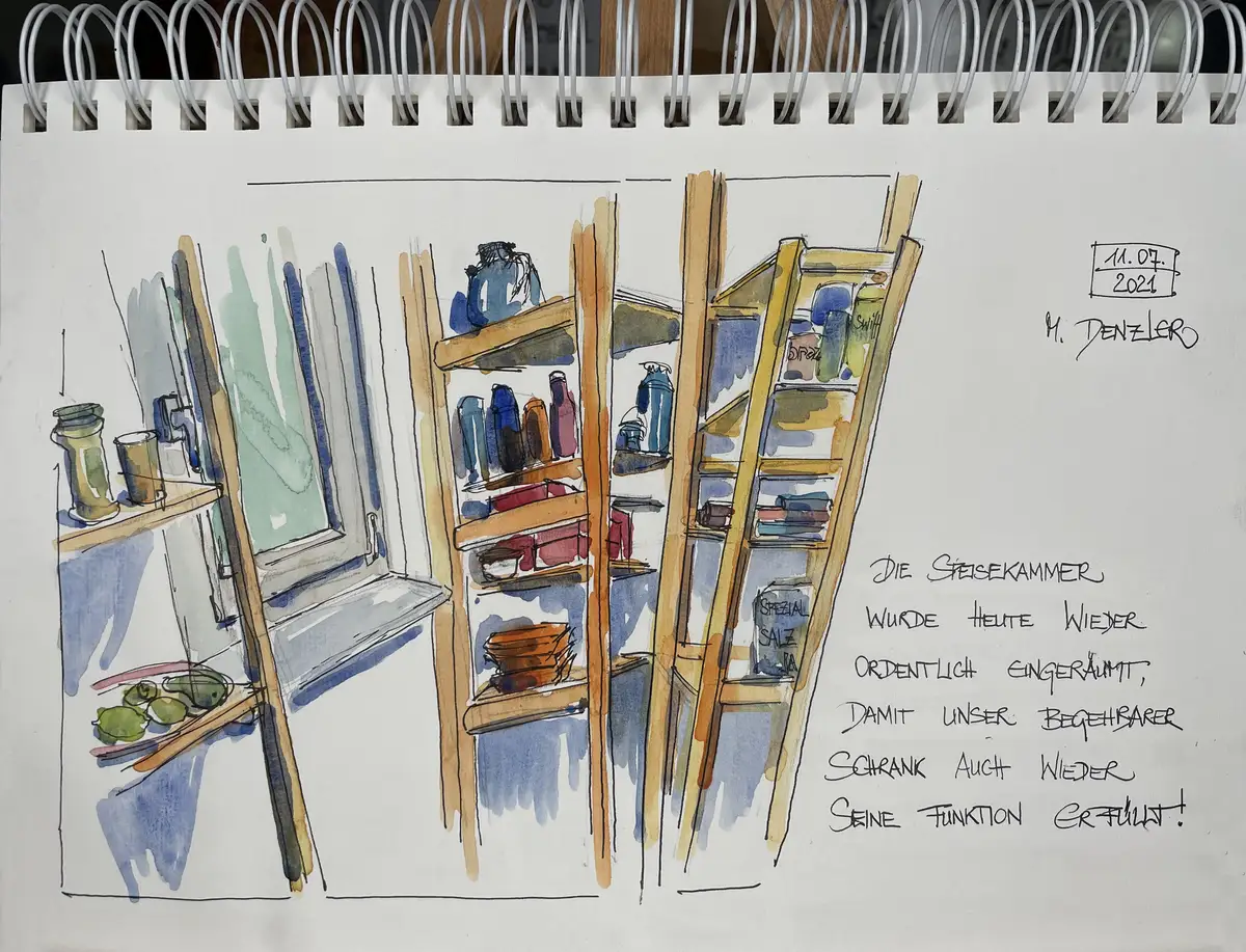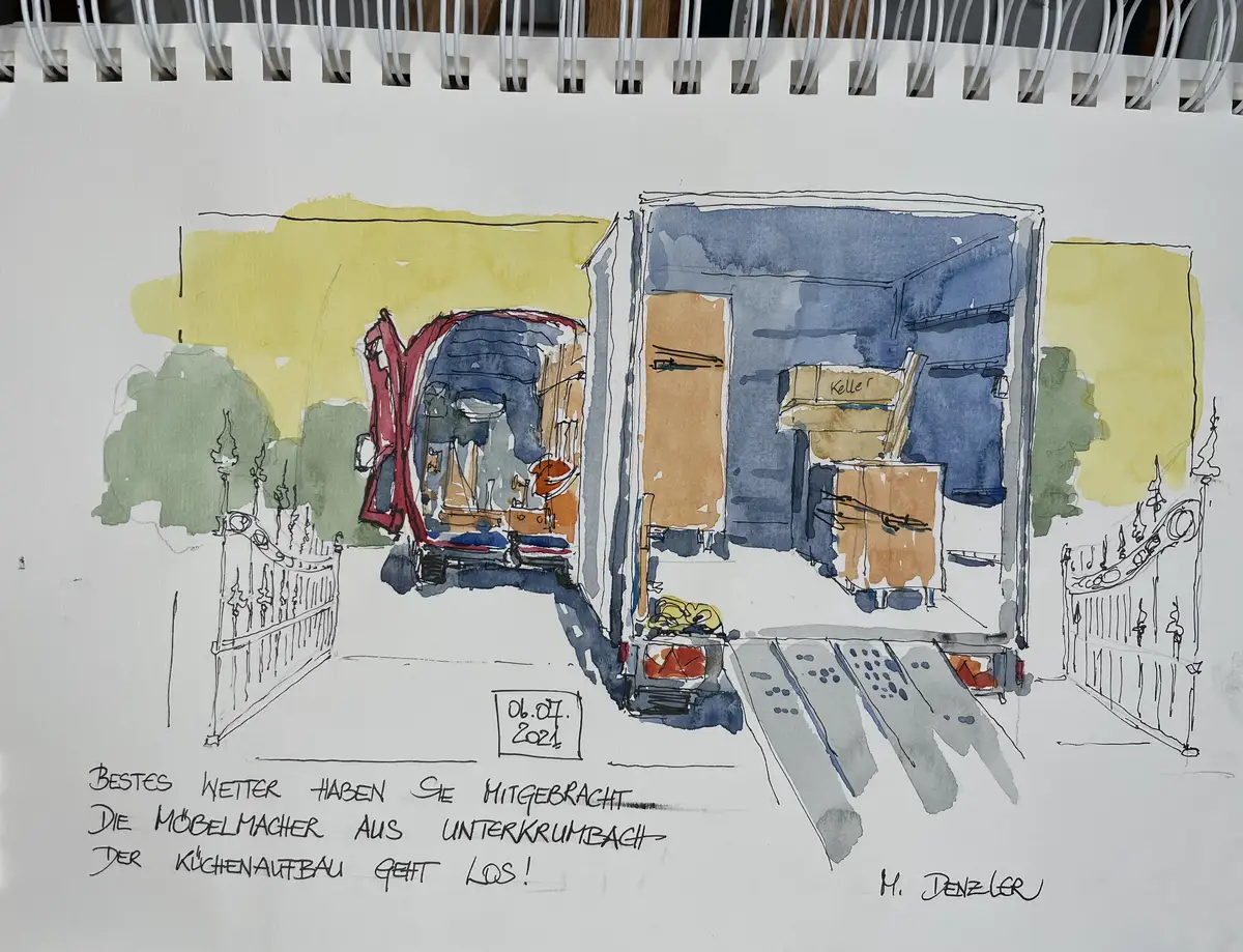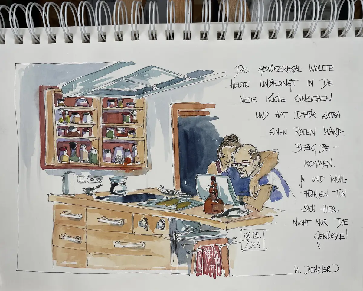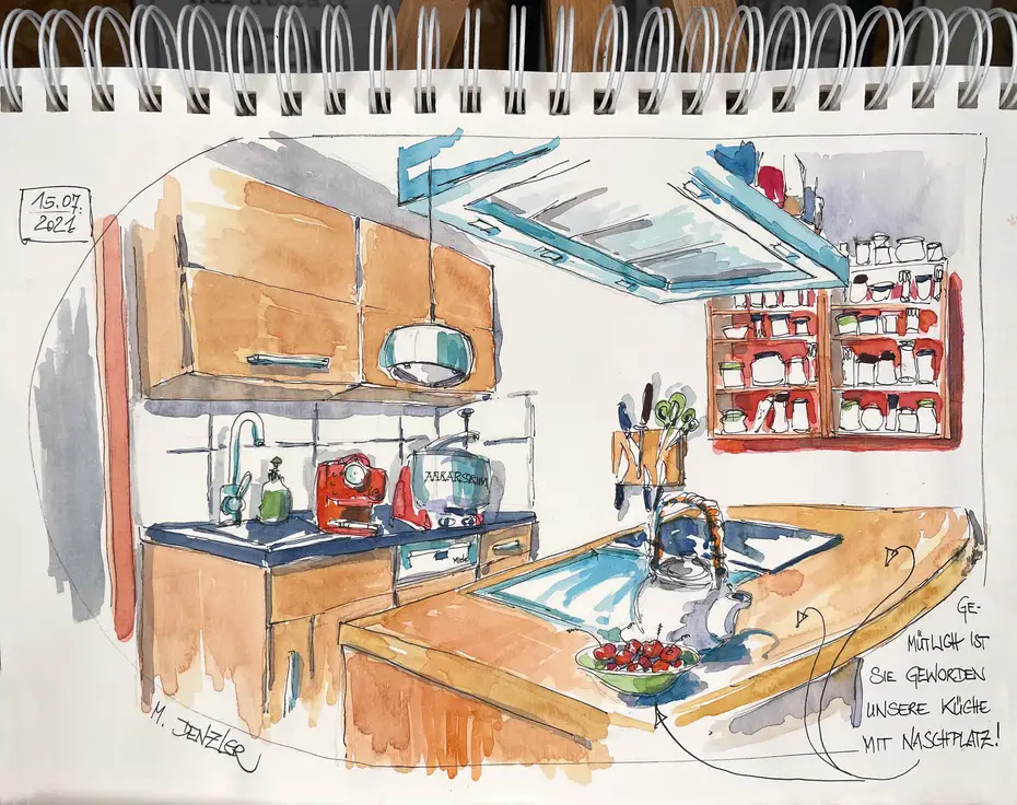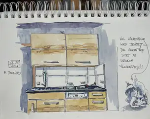 Nein, es geht nicht um die Palim-Palim-Sketche von Herrn Hallervorden oder Monty Python, sondern – wörtlich übersetzt – um „Skizzen“ vom Küchenumbau unserer Kundin Manuela Keller-Denzler. Die Künstlerin und Bauzeichnerin erledigt auch Auftragszeichnungen, was in Kürze wohl zu einer Staffelei in unserer Werkstatt führen wird. Früher sagte man zu schnellen Zeichnungen noch Skribbels, heute hat sich „Sketch“ durchgesetzt. Manuela Denzler ist Spezialistin für ganz viele Techniken, aber aktuell ist der colorierte und vor allem liebevoll beschriftete Sketch ihre Leidenschaft. Wir freuen uns, sie hier für Sie veröffentlichen zu dürfen (mit einem Klick auf die Bilder können sie sie vergrößern.)