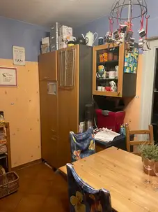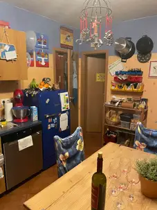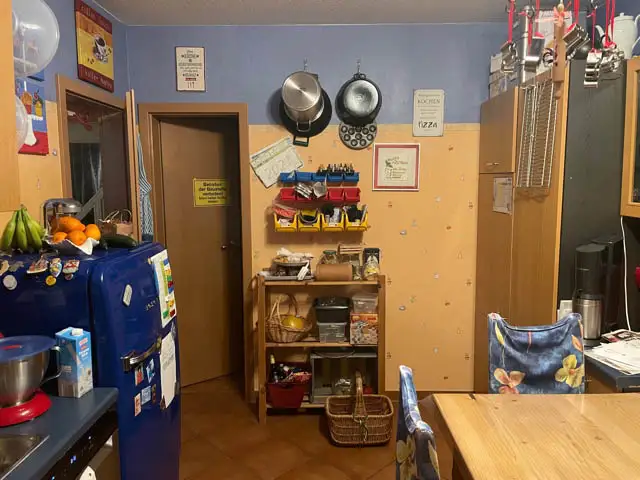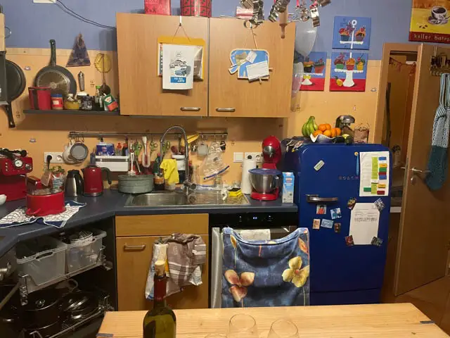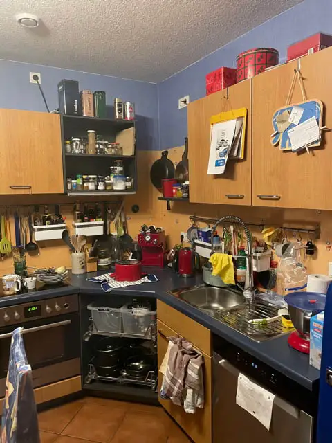 Bei 4 Türen, 288 cm Breite und 391 Länge hat es dank der Klappe und des niedrigen Familiengewichts dann doch geklappt, dass sich die ganze Familie an der 230 langen Kochinsel wohlfühlt. Für dreizeilige Küchen braucht man mindestens 390 cm (60 cm Spülenzeile, 90 cm Platz, 90 cm Kochinsel, 90 cm Platz und 60 cm dritte Zeile), es war also sogar noch ein Zentimeter übrig.