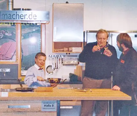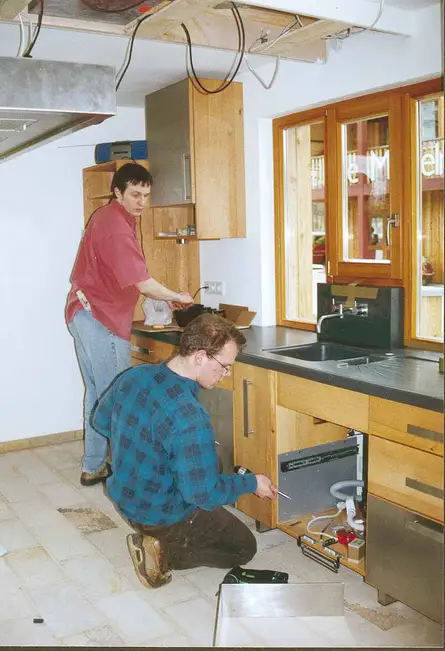 Die Montage war im März 2003. Unser Küchenspezialist Helmut Neugebauer (ist in der Zwischenzeit auch Ernährungsexperte) montiert mit seinem damaligen Lehrling zum 8ten mal die gleiche Küche. (Ausstellung, Consumenta, Ausstellung, Gewerbeschau, Ausstellung, Consumenta, Ausstellung, Musterhaus). Eine Spanplattenküche verliert pro Aufbau die Hälfte an Wert, da bleibt nix mehr übrig, eine Massivholzküche steigt im Wert, weil das Nachölen pro Umbau die Arbeitsplatte noch stabiler macht.