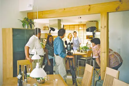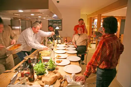 Ostern 2003 zogen wir ein und beim ersten Essen mit Gästen war es wie beim Fernsehen. Grade nachgedacht, dass das das erste Mal ist, dass hier ohne Kameras gekocht wird, da standen die Gäste vom Essplatz auf und gruppierten sich mit Gläsern bewaffnet um das Mittelzentrum herum.