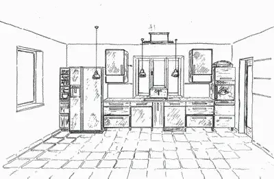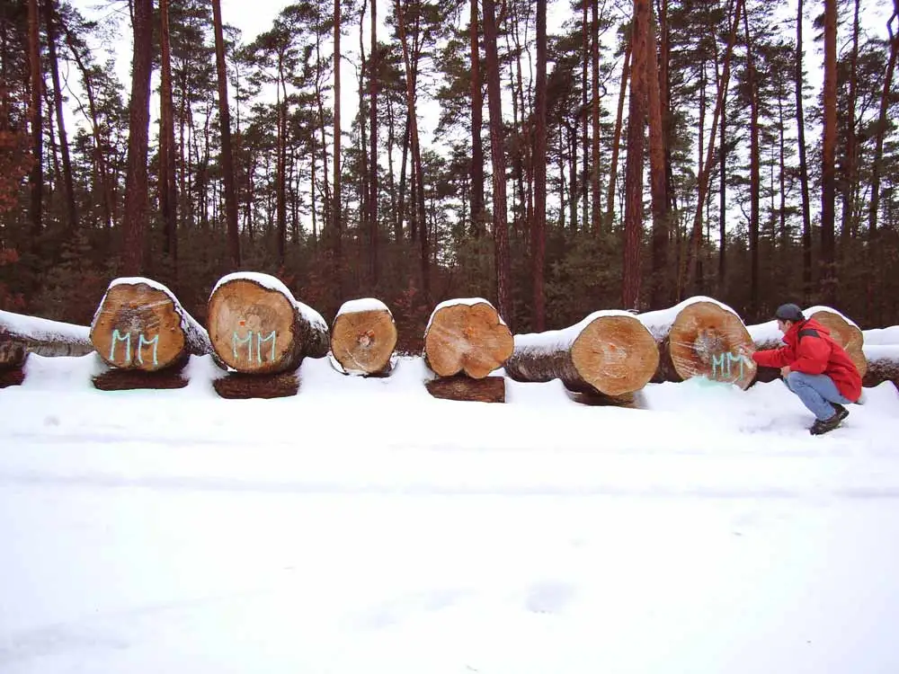 Jetzt nur noch Abholen, Sägen, Stapeln, ein paar Jahre Lagern, Trocknen und dann alles wegschneiden, was nicht nach Utes Küchenzeichnung aussieht. Übrigens haben wir die Tür rechts dann gottseidank weggelassen und die Küche gespiegelt, aber die Symmetrie ist geblieben.