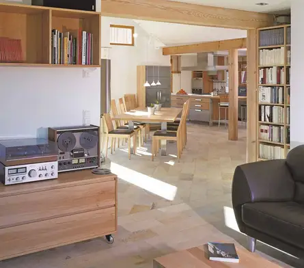 Das regionale Musterhaus sollte eine Küche bekommen, die auch Menschen überzeugt, die sich eigentlich keine Holzküche vorstellen konnten. Erst gab es die Küchenplanung, danach den Auftrag an den Architekten daraus ein Hauskonzept zu erstellen. Lustigerweise lagen die Wünsche der Hausherrin und die des Möbelmachermarketingfuzzis eng aneinander, denn dem Bayerischen Fernsehen Studio Nürnberg hat er für die Consumenta 2000 eine Showküche aus regionalem Holz versprochen.
