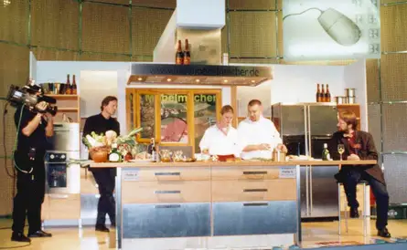 So entstand eine zweizeilige Küche mit großem Mittelzentrum. Logisch, denn das Kochfeld muss in der Mitte liegen, sonst sieht die Kamera ja nichts. Herzstück ist Utes Traum vom Kühlen, der große General Electric Kühlschrank, denn damals gab es die Side by Side Lösungen von Liebherr bzw. Miele noch nicht. Auf der Messe durchlebte die Küche ihre ersten 18 Kochshows mit Profiköchen, danach wurde sie in der Möbelmacherausstellung in Unterkrumbach regelmäßig mit interessierten Kunden und in Kochkursen bekocht.