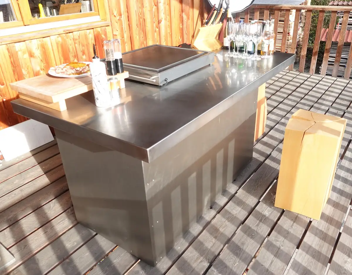 Ihre Outdoor-Edelstahlküche für den Garten fertigen wir genauso nach Maß, wie Ihre Massivholzküchen. Unser Beispiel ist aus Edelstahl und kann mit einem Schraubenschlüssel auch platzsparend im Winter demontiert werden. Oder zählen Sie zu den tapferen Wintergrillern? Dann kann sie natürlich auch das ganze Jahr draußen stehen bleiben.