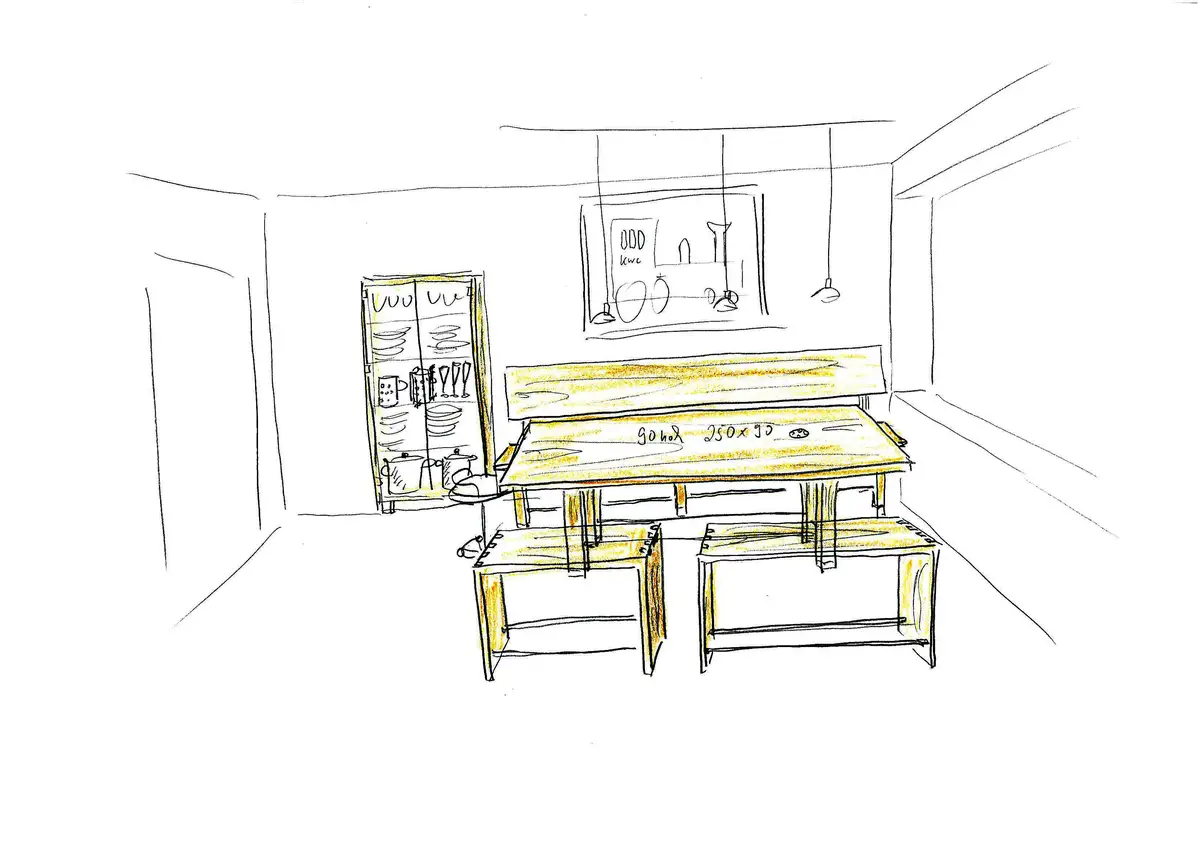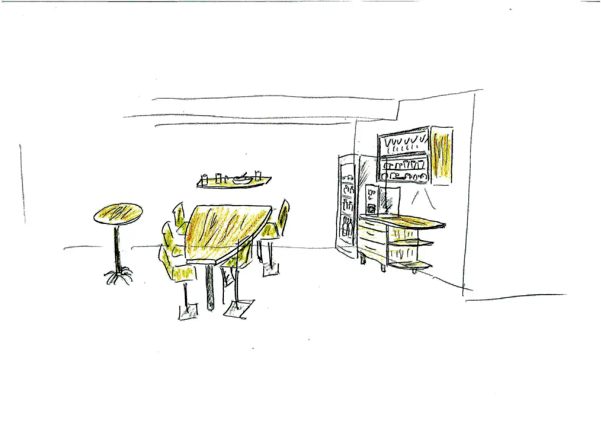 Idee zur Gestaltung des Sozialraums mit hohem Tisch