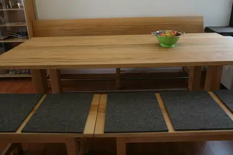 Massivholz macht aus dem Sozialraum einen beliebten Treffpunkt. Der große Tisch auf Arbeitshöhe bietet kochwütigen (Männern?) jede Menge Arbeitsfläche, während es sich die Genießer (-innen?) auf der bequemen Bank gemütlich machen und den köstlichen Speisen harren, die da kommen könnten.