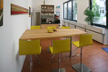 Weil im Erdgeschoss nicht ganz so viel Platz ist, wie für den Sozialraum im ersten Stock wurde dort eine kleine Kaffeecke entworfen, die den Raum optimal ausnützt und ebenfalls gut frequentiert ist, was nach unserer Überzeugung am fränkischen Massivholz und nicht am schnöden Kaffeeautomat liegen muss.