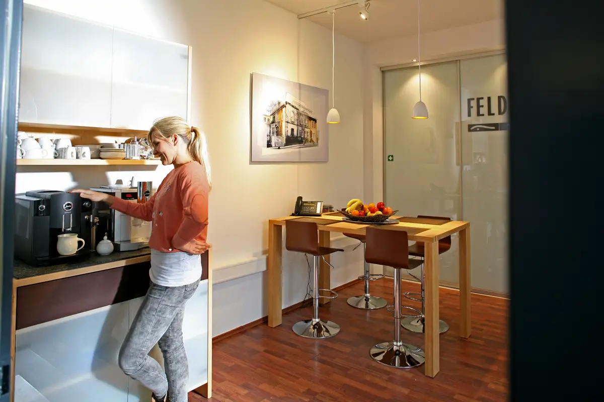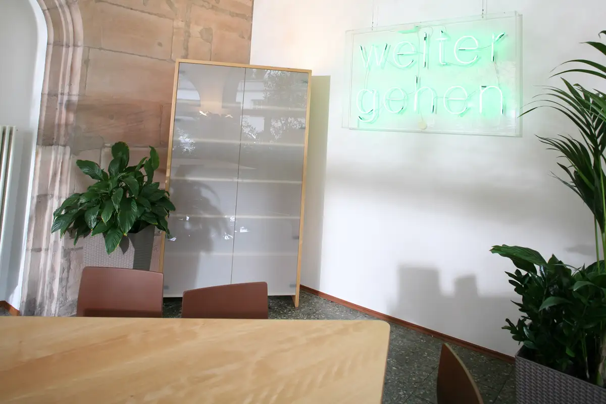 Dort ist die raffinierte Rautenform des Besprechungstisches die einzige Möglichkeit gewesen, die Durchgänge freizuhalten. Gegenüber steht der große Vitrinenschrank mit dem gleichen gezinkten Korpus und bietet noch jede Menge Stauraum. Meetings an Stehtischen sind immer viel kürzer und ergebnisreicher, als die auf normaler Tischhöhe. Und wenn man sich vorher noch schnell einen Kaffee rauslassen kann, ist das die perfekte Work-Coffee-Balance.