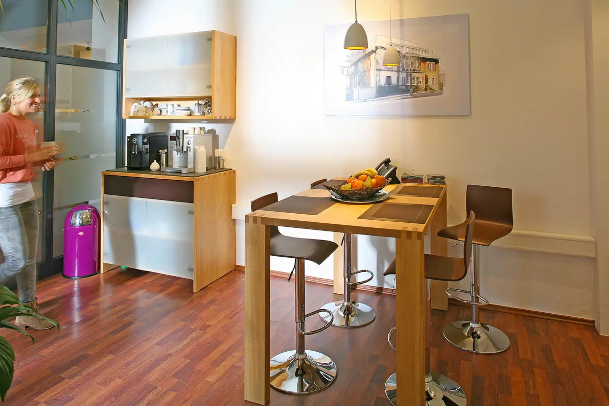 Kaffeebar und Pausenraum mit hohem Tisch und Tresenhockern