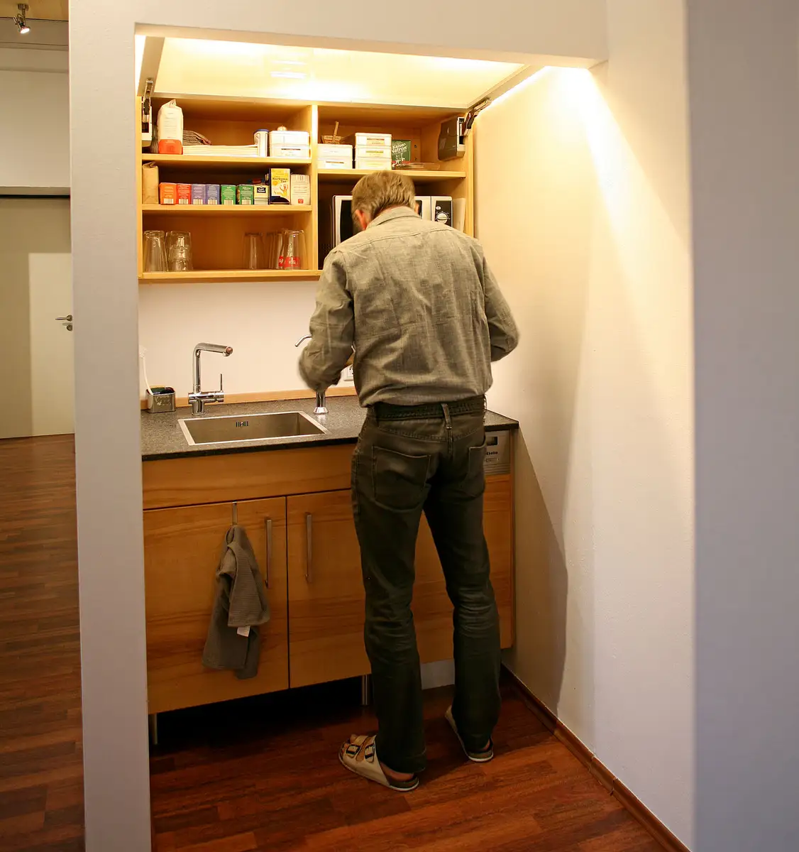 Das ist wohl die kleinste Küche, die wir jemals gebaut haben, aber auch sie bietet dank der Hochfaltklappe im Oberschrank eine Menge Stauraum. Meist wird dort Tee gekocht, aber ein mobiles Induktionskochfeld ist in den Möbeln versteckt, falls doch noch Kochmotivation entstehen sollte.