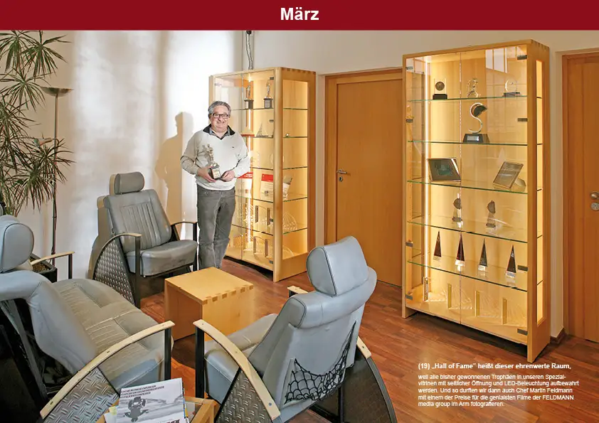 In dieser Lounge vor dem großen Konferenzraum stehen Mercedessessel aus einer alten S-Klasse, die auch zum Arbeitsumfeld der Firma passen. Denn die FELDMANN Media Group macht richtig gute Filme – aber noch viel mehr – unter anderem auch für Mercedes-Benz. Hall of Fame heißt dieser andächtige Raum, weil alle bisher gewonnenen Trophäen in unseren Spezialvitrinen mit seitlicher Öffnung aufbewahrt werden. Und so durften wir dann auch den Chef mit dem Preis im Arm fotografieren, ein Foto, dass Sie sicher im Kalender 2018 wiederfinden werden.