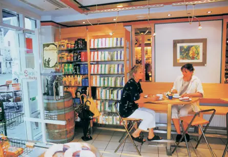 Wunderschönes Café am Laufer Marktplatz von Erika Vogel. Stehtische mit hohen Bänken, niedrige Tische mit konventioneller Bestuhlung und ein Regalsystem, das als Fachböden günstiges Industrieglas verwendete. Wir lieferten auch die Gartenbestuhlung aus heimischen Holz und das Hotelporzellan von Walküre aus Bayreuth.
