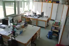 Höhenverstellbaer Massivholz-Schreibtisch im Lehrerzimmer