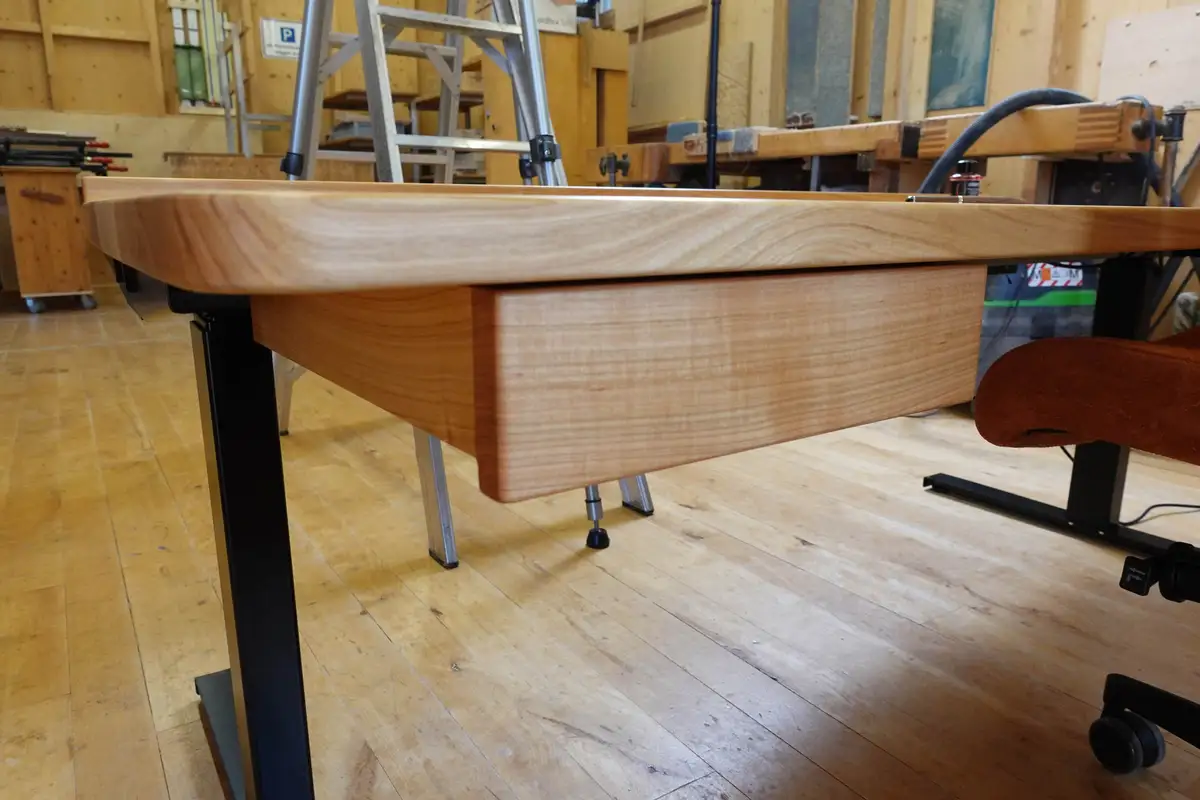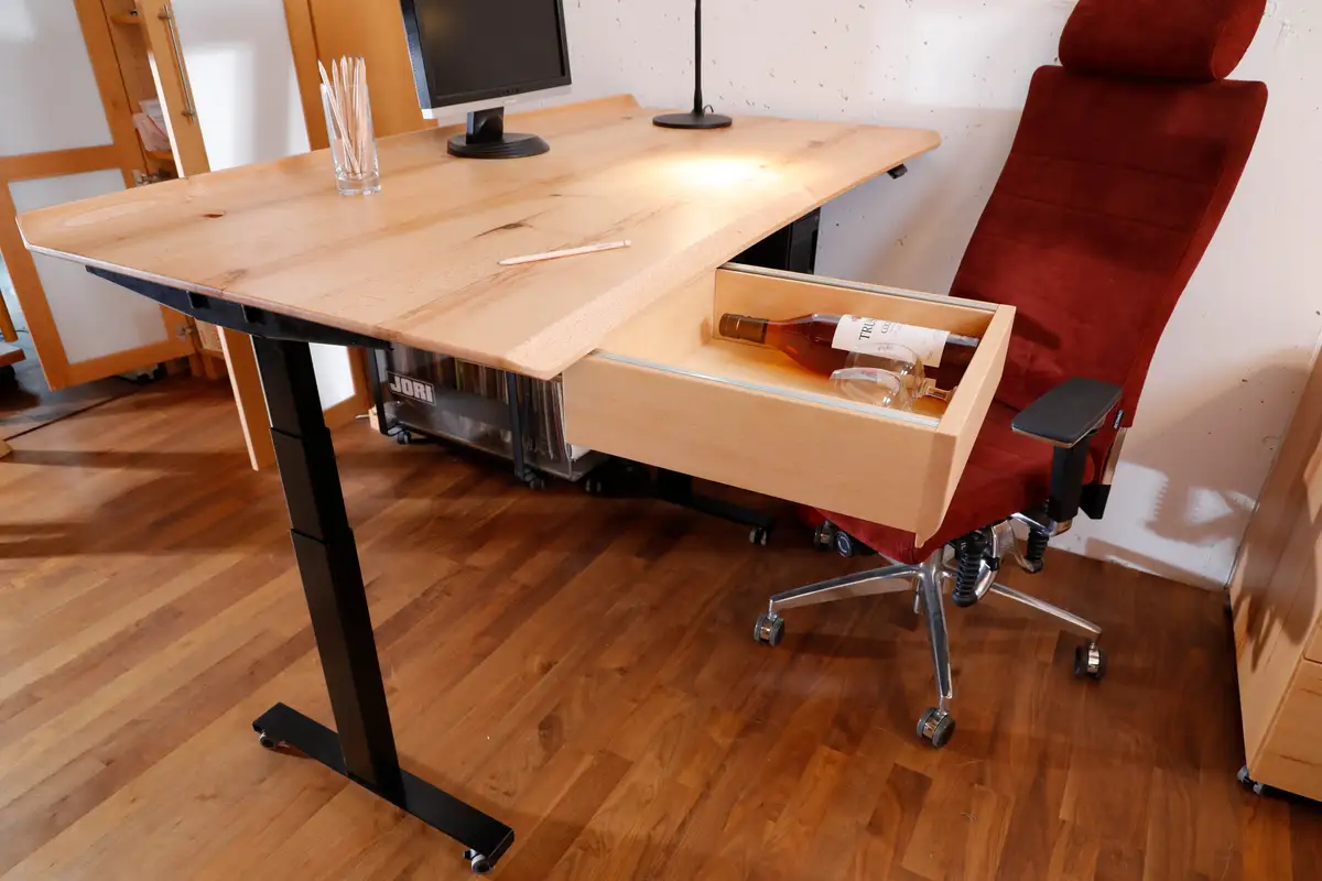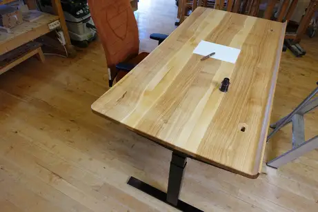 Seit dem Jahr 1997 bauen wir höhenverstellbare Schreibtische. Immer mit den Arbeitsplatten aus Massivholz und immer ganz nach den Wünschen unserer Kunden. Das kann eine einfache Version sein, ein Gestell auf Rollen oder mit Vollverkleidung, Zubehör und Rollcontainer. Nur eine geölte Massivholzplatte - liebevoll verleimt von unseren Schreinerinnen und Schreinern - fasst sich schön an, ist warm, antistatisch und zusätzlich ein echter Hingucker.