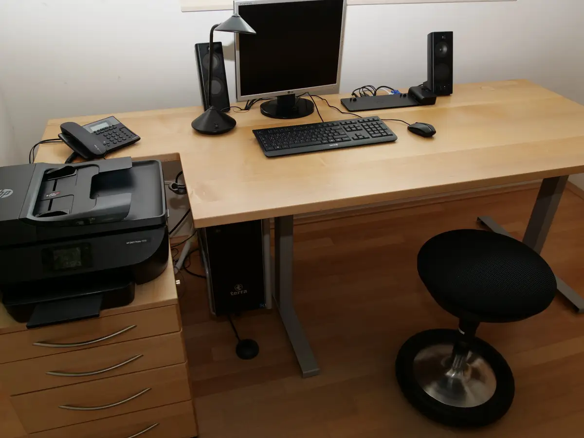 Der Schreibitsch ist höhenverstellbar und bietet leichten Zugriff auf den Drucker