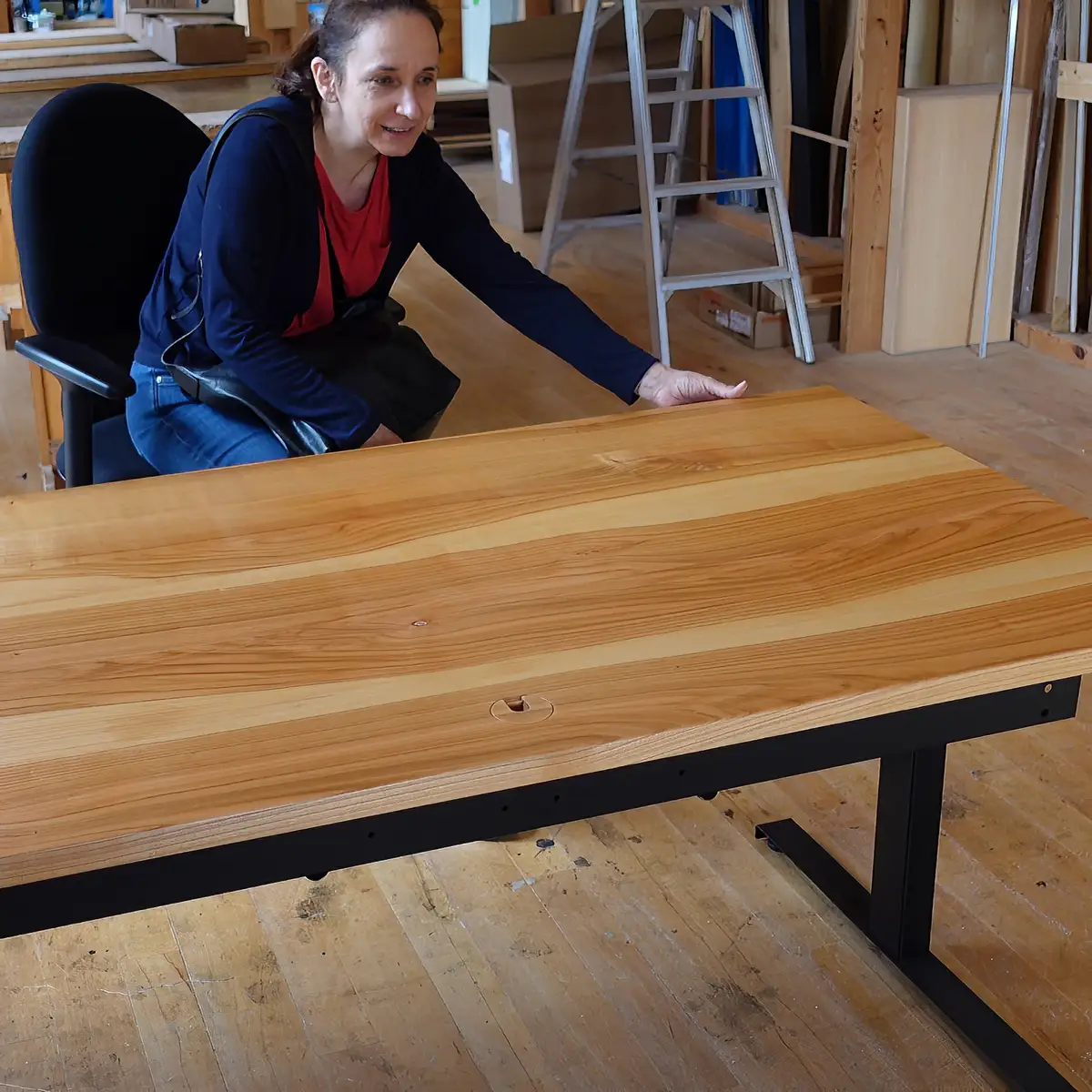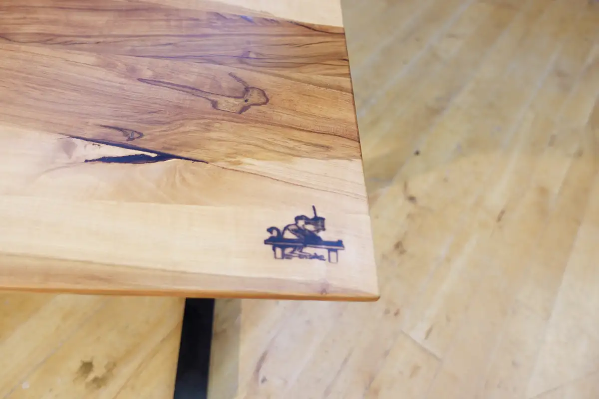 Samuel präsentiert einen höhenverstellbaren Schreibtisch aus wildem Apfelbaum