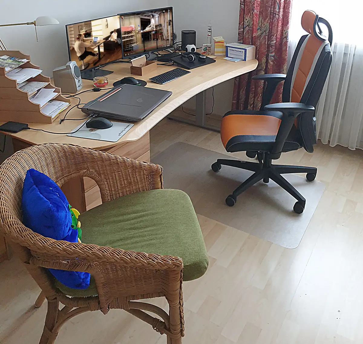 Wenn Sie für Ihre Onlinekonferenzen einen echten analogen und vernünftigen Blickkontakt zur übertragenden Kamera mit attraktivem Hintergrund suchen, können Sie das mit meist peinlichen digitalen Tricks versuchen oder Sie schieben Ihren Schreibtisch auf unseren Lenkrollen einfach dorthin, wo Sie und der Hintergrund in echt gut aussehen. Im folgenden Video sehen Sie die Möglichkeiten, die wir durch gemeinsam entwickelte neue Ideen noch gewaltig steigern könnten.