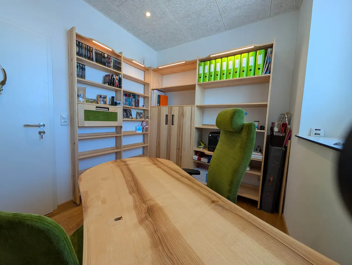 Das Büro ist wahrlich nicht groß, aber durch den schräggestellten Schreibtisch passt sogar noch ein Besucherstuhl im gleichen Leder wie der Bioswing-Bürostuhl von Haider und der Sekretärklappe rein. Das ist der erste Schreibtisch, der auch stirnseitig eine Bleistiftrunterrollschutzkante bekommen hat, auf der Besucherseite haben wir sie auslaufen lassen, um den Gast nicht auszuschließen.