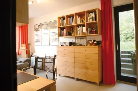 Stauraum an der schrägen Wand dank Containermöbeln aus Ahorn und Zwetschge, die man irgendwann mal problemlos auch in normale Raume stellen kann