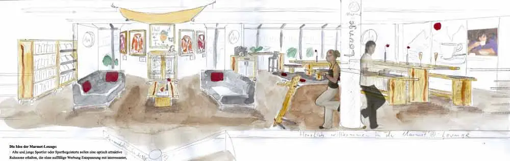 - Alte und junge Sportler oder Sportbegeisterte sollen eine optisch attraktive Ruhezone erhalten, die ohne auffällige Werbung Entspannung mit interessanter, aber auch origineller und amüsanter Information verbindet.