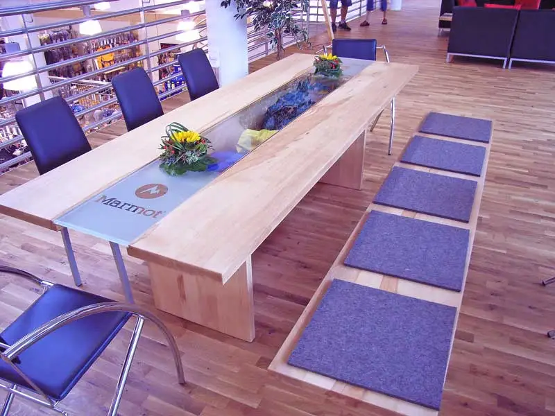 - Dazu verwendet Marmot die massive und rotkernige Buche aus der Hersbrucker Alb, die sehr naturnah mit einigen Ästen und Rindenstücken in edler, gastronomie- und küchenerprobter Öloberfläche Generationen überdauern wird.