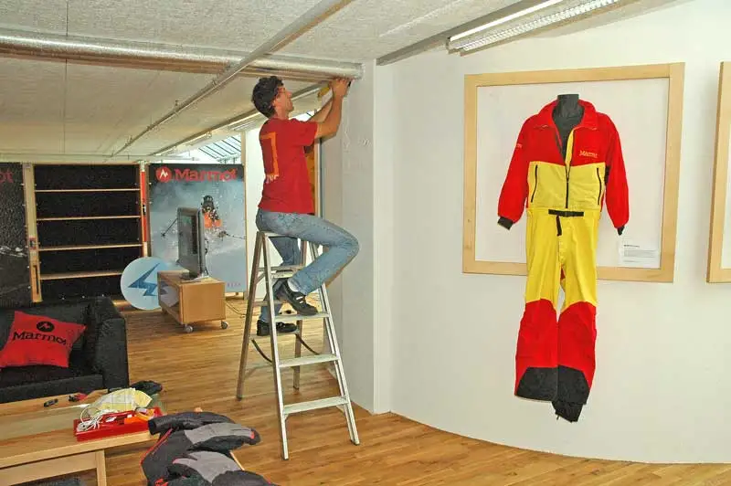 - In der "Hall of Fame" informieren historische Marmot-Produkte über die 30-jährige Firmengeschichte. Wie in einer Kunstausstellung hängen dazu edle Holzrahmen an der Rundung des Treppenhauses, sorgfältig beschriftet.