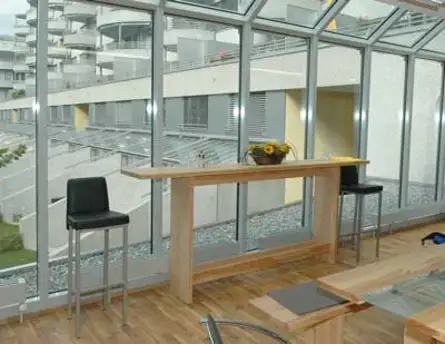 - Für Meetings, Vorträge mit Beamer/Leinwand, Buchvorstellungen oder andere Anlässe, lässt sich alles leicht verschieben. Ein Display kann als Rednerpult verwendet werden, ein Stehtisch ermöglicht die Kaffeetasse zwischendurch und auf einer 270cm langen, 45 cm breiten Theke können aktuelle Zeitschriften, Zeitungen und Bücher ausgelegt werden.