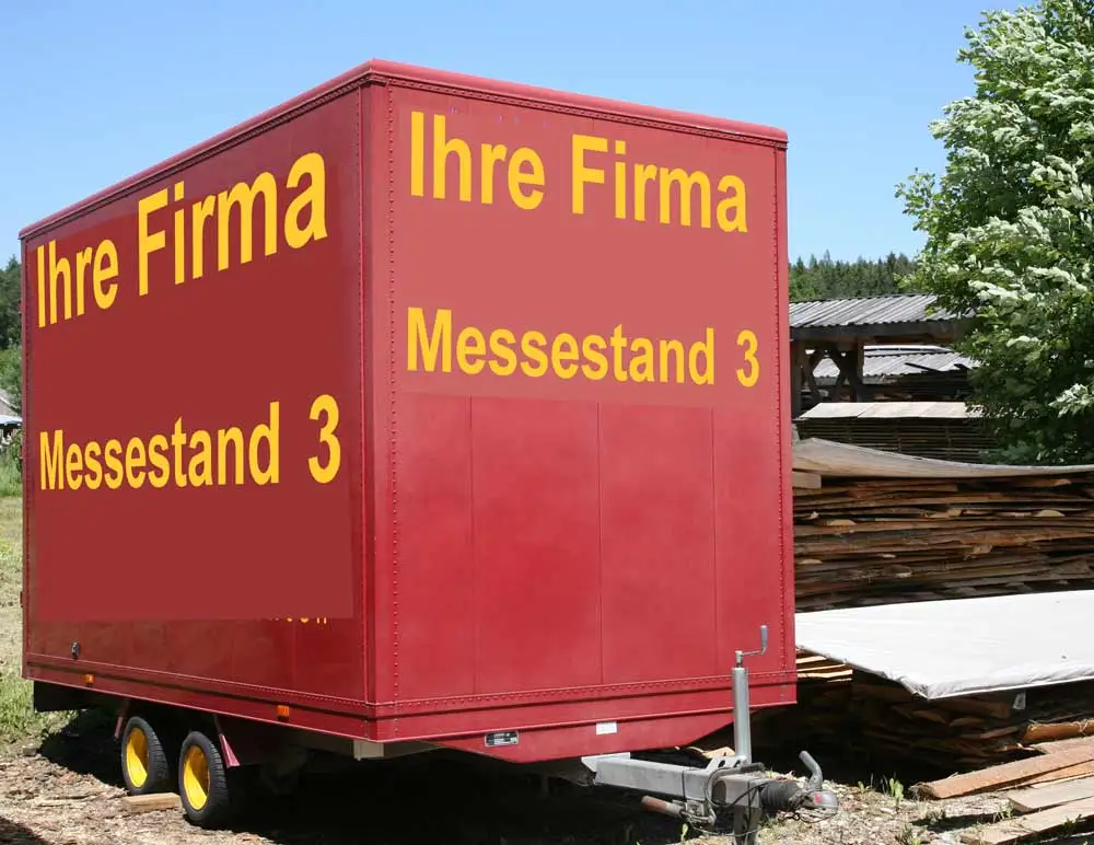plumpe Fotomontage Ihres neuen Messestandes im Spezialanhänger