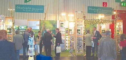 Stilisierte Hopfenstangen vervollständigen das Bild vom Hopfenfeld. Über die Verbindungstraversen der Regale lassen sich die Papierbahnen aus Großformatdruckern hängen, sodass ohne großen Aufwand für jede Messe andere Schwerpunkte gesetzt werden können. Auf der Biofach können Sie sich selbst ein Bild machen und dabei auch noch jede Menge Bier- und Getränkespezialitäten aus kontrolliert biologischem Anbau testen. Denn Öko-Marketing hin oder her, das Bier muss vor allem schmecken!