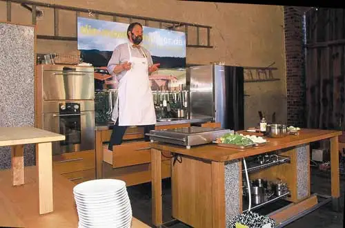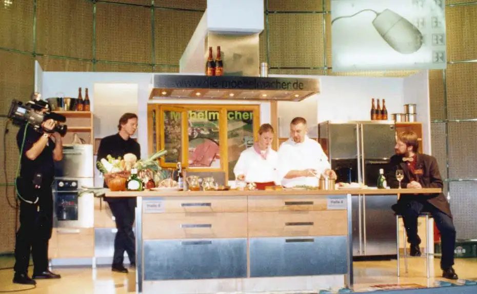 Fast immer haben wir unsere Massivholzküchen dabei, auf der Consumenta sogar drei. Eine auf der Bühne des Bayerischen Fernsehens, eine auf unserem eigenen "Verkaufsstand" und eine auf der Bühne des Veranstalters Afag, für die wir mit unseren Köchen Kochshows und die VIP-Testessertafel veranstalten. Die Küche im harten Kochalltag mit Profiköchen überzeugt mehr, als die schönste aber leblose Ausstellung. Wir demosntrieren die Lebensqualität und Pfelgeleichtigkeit unserer Küchen, indem wir zum Beispiel das Edding-Autogramm von Patrick Lindner Stück für Stück entfernen, natürlich nicht ohne nachzufragen, ob jemdnad die Küche wegen des Autogramms kaufen möchte.
