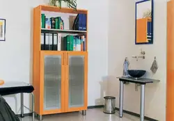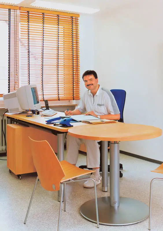 Dr. Kolb hat einen höhenvestellbaren Besprechungstisch (denn es geht wesentlich schneller mit Vertretern im Stehen zu diskutieren) und als Türfüllungen gesandstrahltes Glas.