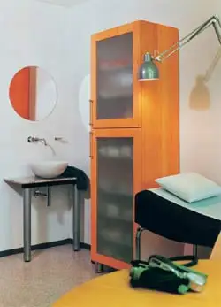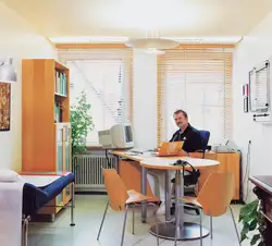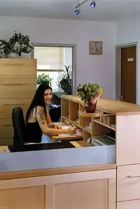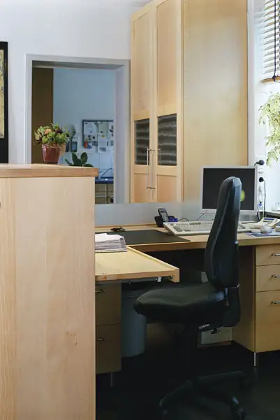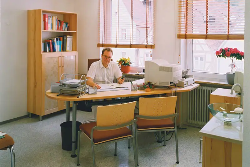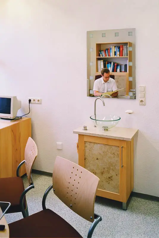 2001 bauten wir die Behandlungszimmer von Dr. Kolb und Dr. Träg , im Jahr 2004 kam der Empfang und das Zimmer des neuen Kollegen Dr. Kirschke dazu. Die drei Ärtzte einigten sich auf das gleiche Holz und die gleiche Formensprache, aber die individuelle Note jedes einzelnen blieb erhalten.